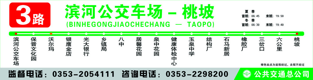 濱河公交車場(chǎng) - 保晉文化園 - 銀鷹金店–光大銀行 - 鄉(xiāng)鎮(zhèn)局 -  八中 - 居馨花園 - 泉中花園 - 健康體檢中心 -  玉泉中學(xué) - 結(jié)構(gòu)廠 - 石馬新居 - 橡膠廠 - 三 岔口 - 六公里 - 桃坡
